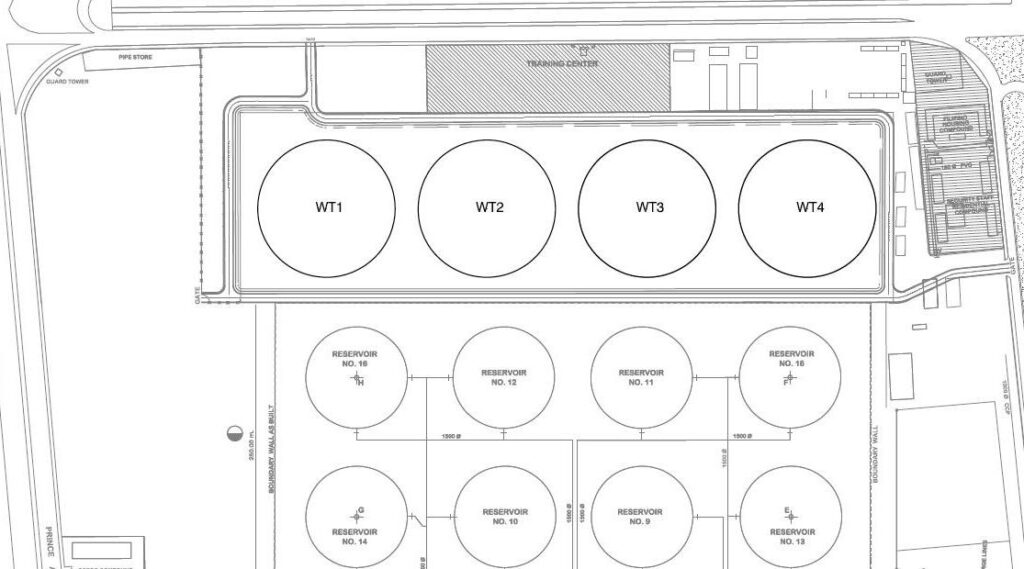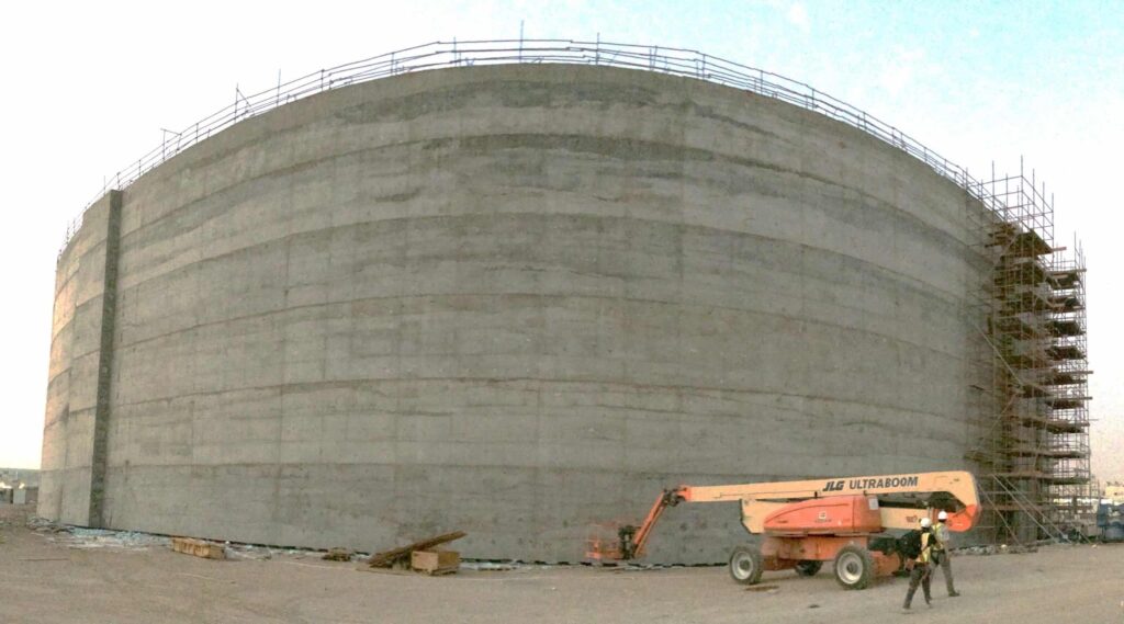 The tanks are constructed in pre-stressed concrete and their walls are 90cm thick. The walls are supported by an 80cm thick ring slab foundation.