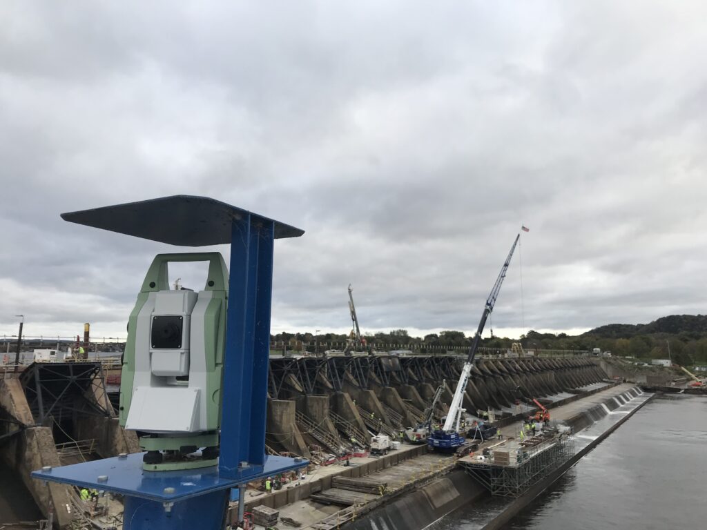 Due to the remediation project, a state-of-the-art automated movement monitoring system was needed to measure any potential dam structure movements prior to, during, and after the construction of the dam for risk control and construction effect evaluation. Sixense’s system consisted of three automatic motorized total stations (AMTS), measuring over 120 monitoring prisms installed on the 42 spillway piers, providing near real-time data delivery.