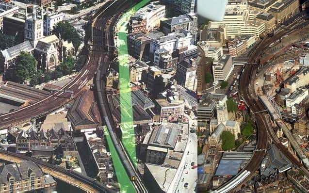 Between London Bridge and the vicinity of Stoney Street, the extra pair of tracks are on a new viaduct to the south of the existing one. This has required the demolition (and subsequent replacement) of a group of buildings within Borough Market, which is a conservation area.
