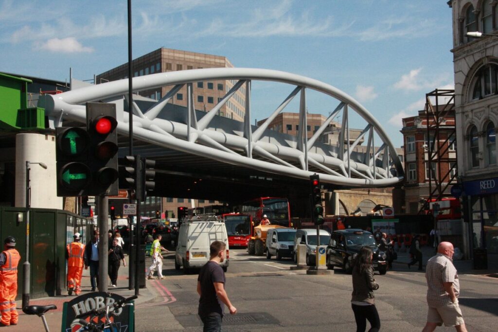 West of Stoney Street, most of the widening of the existing viaduct has been to the north, to avoid affected the Hop Exchange building to the south.