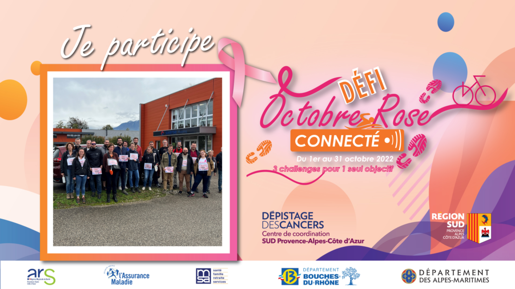 Grâce aux 155 inscriptions de nos collaborateurs, nous sommes heureux de pouvoir reverser la somme de 2 325 € au Centre régional de coordination des dépistages des cancers sud Provence-Alpes-Côte d’azur (organisateur du Défi Octobre Rose Connecté et unique acteur régional missionné par le ministère de la santé pour organiser les programmes de dépistage des cancers du sein, colorectal et du col de l’utérus).